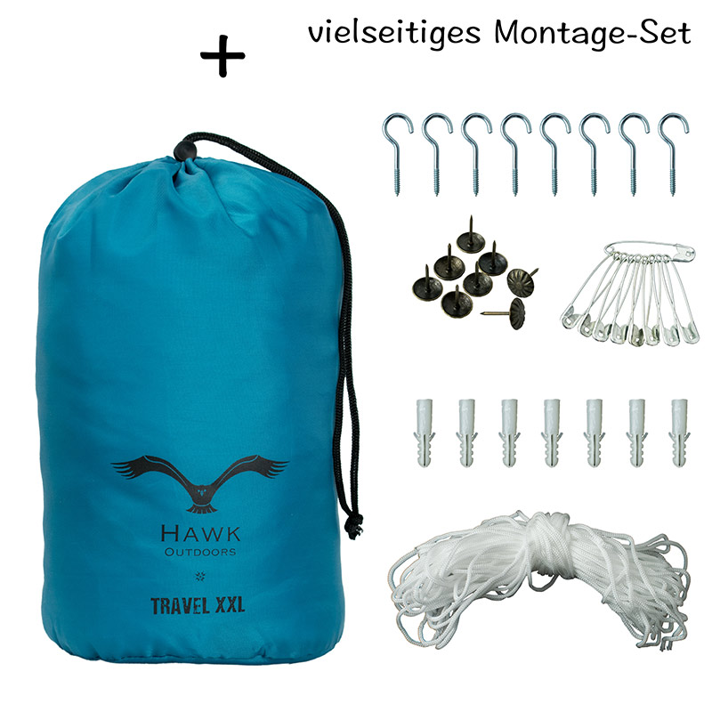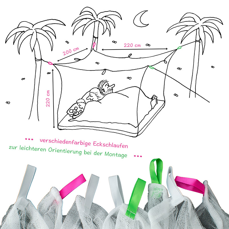 GROSS, LEICHT & KOMPAKT: Das Netz für Doppelbetten kommt im seltenen Idealmaß von 220x200x220cm, das für Einzelbetten misst 220x100x220cm. Die 8 bzw. 6 Eckschlaufen ermöglichen eine einfache Anbringung unter verschiedensten Voraussetzungen. Durch die Höhe von 220cm lässt es sich darin auch noch angenehm stehen.